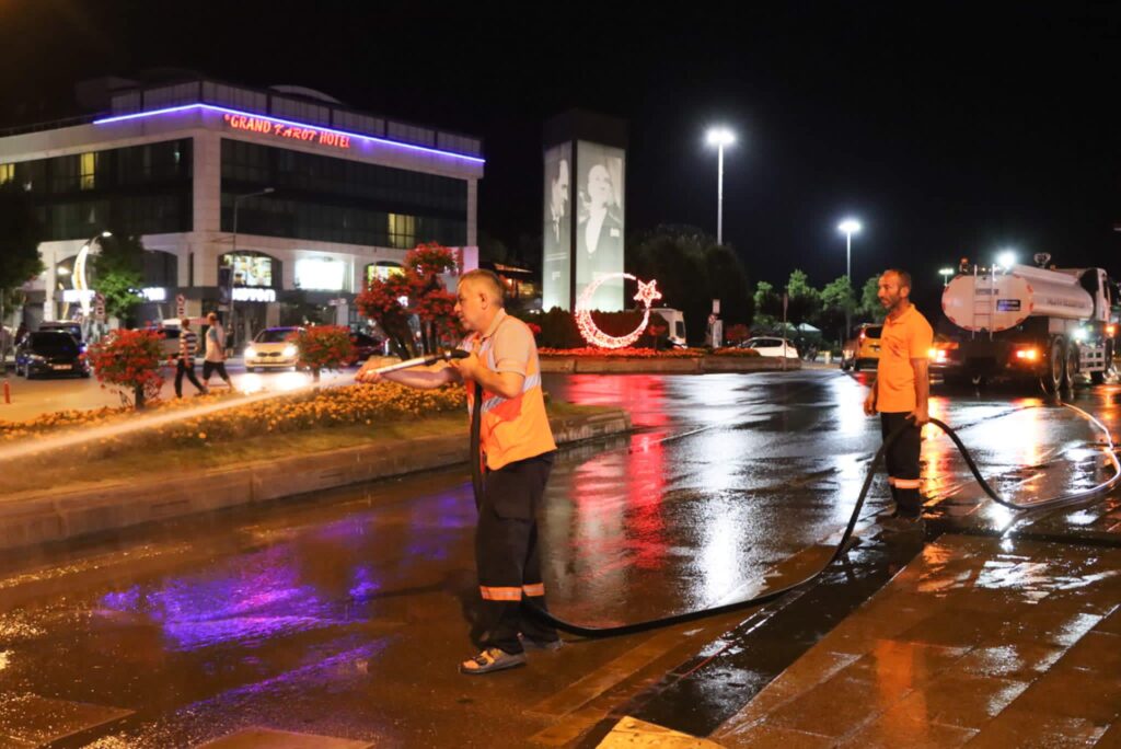 Şehrin her noktasında temizlik çalışmalarına aralıksız olarak devam eden Yalova Belediyesi ekipleri, bu kez Cumhuriyet Caddesi’nde detaylı bir çalışma yaptı. Gece geç saatlerde, Şehir Ömer Faydalı Caddesi’nin Cumhuriyet Caddesi ile kesişiminden başlatılan temizlik çalışmasında; tazyikli su ile tüm kaldırımlar, yollar ve duraklar dip köşe temizlendi. Atatürk İlköğretim Okulu önünden bir diğer araçta çalışmaya destek verdi.